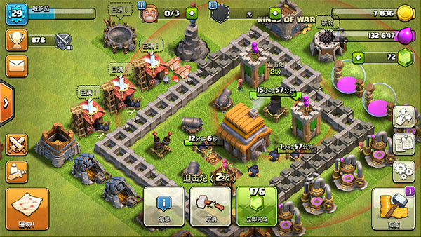 (2)玩家每次進(jìn)入游戲,都默認(rèn)在村莊地圖里。玩家在村莊地圖內(nèi),去建造大本營、城墻、兵營等各種建筑,來生產(chǎn)更多的資源,來提升自己的軍隊實力。玩家在村莊地圖內(nèi),可查詢自己等級、貨幣、資源數(shù)量、建筑數(shù)量等信息,而且還能進(jìn)行訓(xùn)練兵種、升級建筑等級、收集各種資源、布置各種資源和建筑物等操作。
