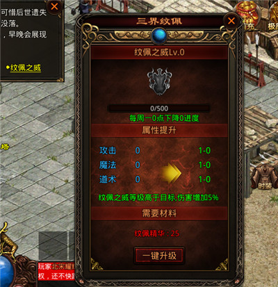 紋佩之威是《斬魔無雙》中一個提升主角攻擊屬性的玩法,開服45天后可在中州三界紋佩(421,254)處查看。累積一定的紋佩精華后,可對紋佩之威進(jìn)行升級,等級越高屬性越強(qiáng)。而在玩家對戰(zhàn)時,紋佩之威等級高于對方還可以造成額外傷害