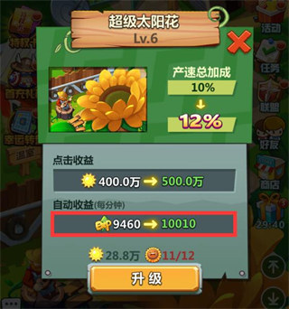 2、在超級太陽花界面可以看到英雄經(jīng)驗(yàn)每分鐘的產(chǎn)速,除了升級太陽花以及擁有經(jīng)驗(yàn)大師這一特殊技能的橙色英雄可以提高獲得英雄經(jīng)驗(yàn)的產(chǎn)速,在游戲中完成部分主線任務(wù)、戰(zhàn)斗勝利后都能直接獲得英雄經(jīng)驗(yàn)。