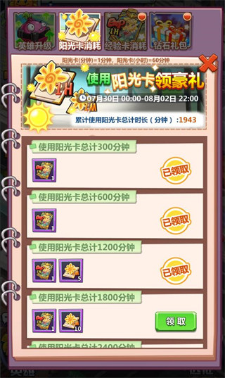 參與不定期開放的限時(shí)活動(dòng),在活動(dòng)期間內(nèi)提升英雄等級、消耗一定數(shù)量的英雄經(jīng)驗(yàn)卡以及累計(jì)一定時(shí)長的陽光卡使用,都能在活動(dòng)頁面領(lǐng)取到包含英雄經(jīng)驗(yàn)卡在內(nèi)的豐厚獎(jiǎng)勵(lì)哦。
