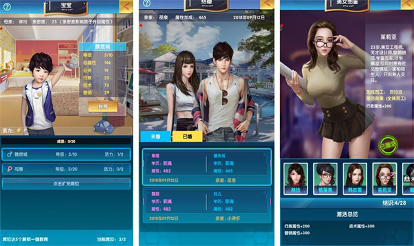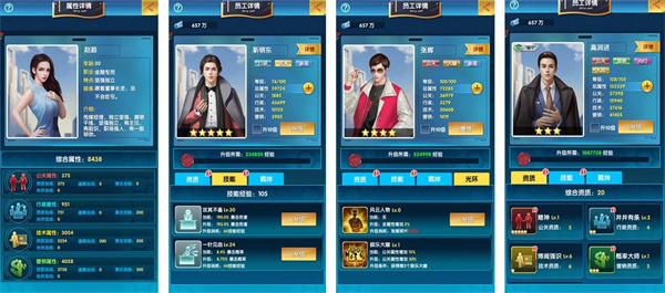 1、資質(zhì)加成:每個員工都有至少四種資質(zhì)(四種屬性),資質(zhì)分星級(1-4星資質(zhì)有兩種方案,5星資質(zhì)有三種方案),選用方案可對資質(zhì)進行升級提升屬性上限