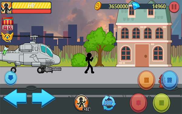 1、玩家要控制火柴人不斷的跳躍躲避敵人的子彈,然后通過強(qiáng)大的火力壓制敵人;