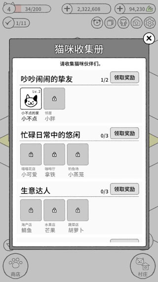 2、貓咪等級:貓咪升級需要一定的魚干,通過照料貓咪來獲得愛心。