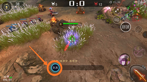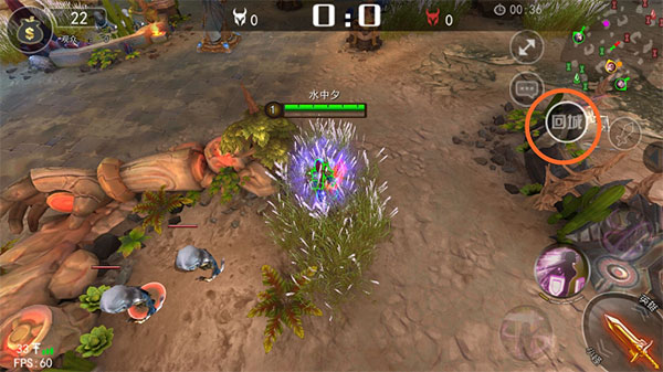 進(jìn)入草叢后,會(huì)出現(xiàn)“回城“二字,如圖,點(diǎn)擊后,幾秒鐘后便可到己方泉水。