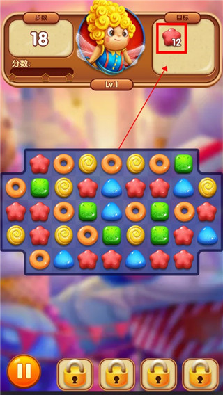 1、進(jìn)入游戲,右上角的是本局目標(biāo),在步數(shù)消耗完之前達(dá)成就算過關(guān)。