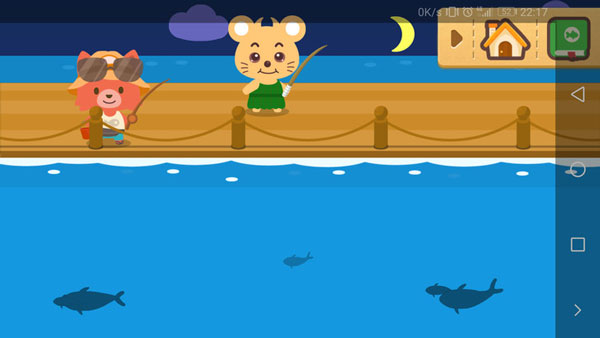 6、當(dāng)你覺得無聊的時候,你可以點擊下方的魚的標(biāo)志,跟著你的鄰居一起去釣魚,釣魚的方法很簡單,點一下河面是拋竿,然后等到有魚上鉤了之后就再點一下屏幕,魚就可以上鉤了,每次都會調(diào)到不同的魚,運氣好的時候還會調(diào)到一些珍稀物種哦。