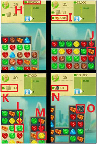 3、目標3:從面板(K)上消除白色瓷磚(L)。有些瓷磚可能隱藏在其他障礙(M)之下。