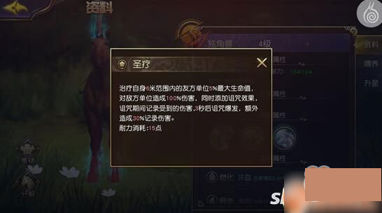 獨(dú)角獸技能:圣療能夠?yàn)?米范圍內(nèi)治療5%的生命值還能照成100%的傷害同時(shí)添加詛咒效果。