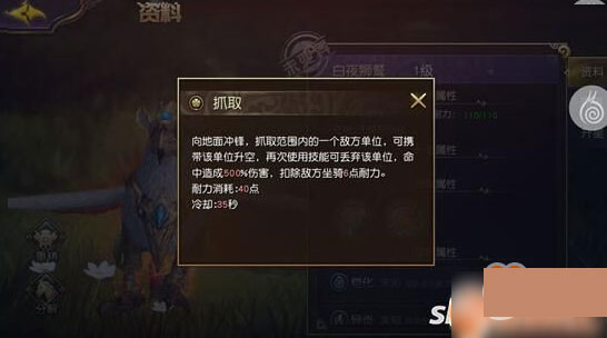 白夜獅鷲技能:抓取向地面沖鋒抓取抓取選取范圍內(nèi)敵方單位,可攜帶該單位升空,再次使用技能可丟棄該單位,命中照成500%傷害