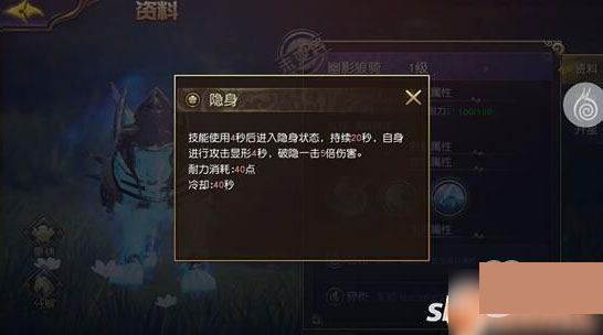 幽影狼騎技能:隱身在使用技能四秒后能進(jìn)入隱身狀態(tài),持續(xù)20秒,自身進(jìn)行攻擊顯醒4秒,破隱一擊五倍傷害。