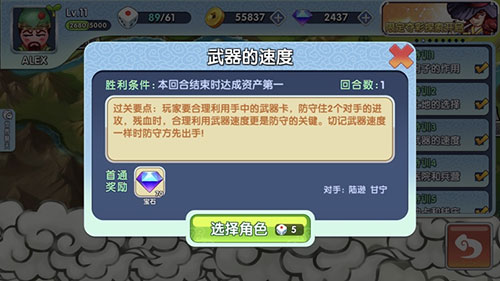 過關(guān)要點(diǎn):玩家要合理利用手中的武器卡,防守住2個(gè)對(duì)手的進(jìn)攻,殘血時(shí),合理利用武器速度更是防守的關(guān)鍵。切記武器速度一樣時(shí)防守方先出手!
