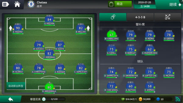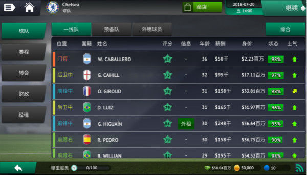 ?8、買下這兩人之后,手里的錢所剩無幾,就這樣吧,主打4321,門將科帕(80),左后衛(wèi)阿隆索(80),中后衛(wèi)斯通斯(80),魯?shù)细瘢?0),右后衛(wèi)阿茲皮利奎塔(82);三后腰若日尼奧(82),科瓦西奇(79),坎特(87),前場(chǎng)阿扎爾(90),威廉(82),前鋒維爾納(82),主力陣容中,年齡最大的阿茲皮利奎塔28歲,其他人基本都在26歲以下,平均年齡24歲,年齡結(jié)構(gòu)非常好,可以暫時(shí)從轉(zhuǎn)會(huì)市場(chǎng)里離開,開始新賽季咯。