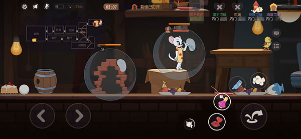 4、正式開始游戲,老鼠需將不同的奶酪搬到不同的洞口,并將奶酪強塞入老鼠洞,這個過程需要較長的時間,以便貓咪可以及時反擊。老鼠綁到火箭上,時間一到便會送出賽場。老鼠間可以救援被綁老鼠,通過丟物品或使用技能砸暈貓咪進行干擾。