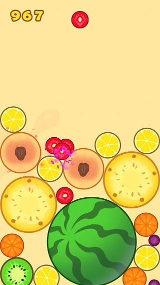 4、控制水果掉落的方位,相同的水果合并在一起會(huì)產(chǎn)生新的水果