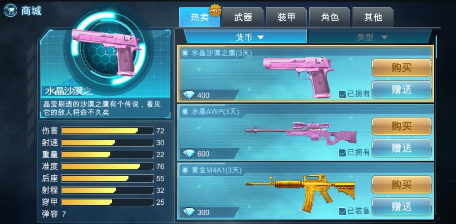 商城用于出售武器、裝甲、角色、飾品、子彈等裝備道具和功能性道具,玩家也可以在商城進(jìn)行物品贈(zèng)送。商城出售的物品,除子彈按數(shù)量收費(fèi)之外,其余物品都是按使用時(shí)長(zhǎng)收費(fèi),解鎖武器的覺醒技能,可以開放永久購(gòu)買。