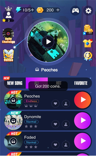 玩家在游戲中可以伴隨音樂節(jié)奏敲擊下落的音符,或通過滑動(dòng)的方式連擊連續(xù)的旋律音符以獲得暢快的游戲體驗(yàn),游戲過程中,不僅有音樂帶來的聽覺享受,更有“演奏”音樂帶來的爽快感!