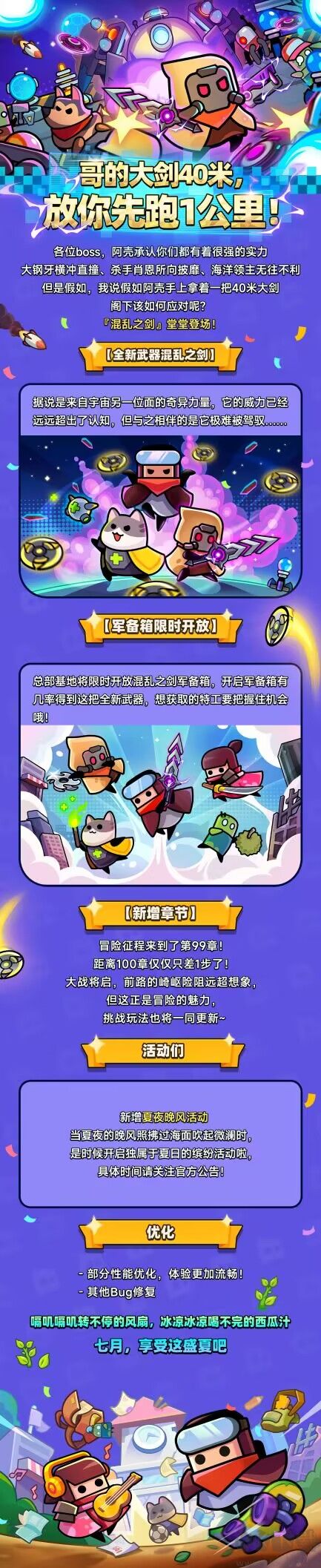 -新增混亂之劍軍備箱,開啟有概率得到混亂之劍-新增4個新章節(jié)至第99章及其對應(yīng)的挑戰(zhàn)章節(jié)!-新增夏夜晚風活動