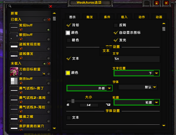 可以設置通過光環(huán),事件,狀態(tài),等來控制你的特效的顯示狀況(當不在配置模式)。默認的觸發(fā)類型是“光環(huán)”,把特效的顯示狀況和一個或多個BUFF或DEBUFF聯(lián)系起來。在選擇光環(huán)時可以輸入光環(huán)的名字,部分名字或者法術ID
