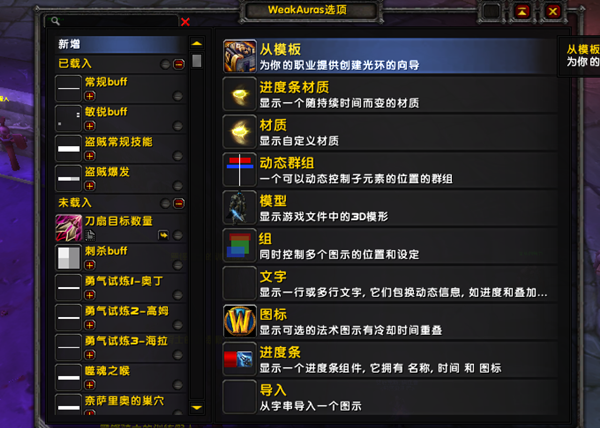 weakauras不附帶任何預先配置的特效,在創(chuàng)建特效之前,打開配置用戶界面輸入/WA或/weakauras。然后出現(xiàn)配置版面,提示你選擇特效。不同的特效有不同的性質和功能。如果這是您第一次使用weakauras,使用最簡單的特效:材質。點擊按鈕標記為“材質”將創(chuàng)建一個新的材質特效顯示在左邊的工具欄。