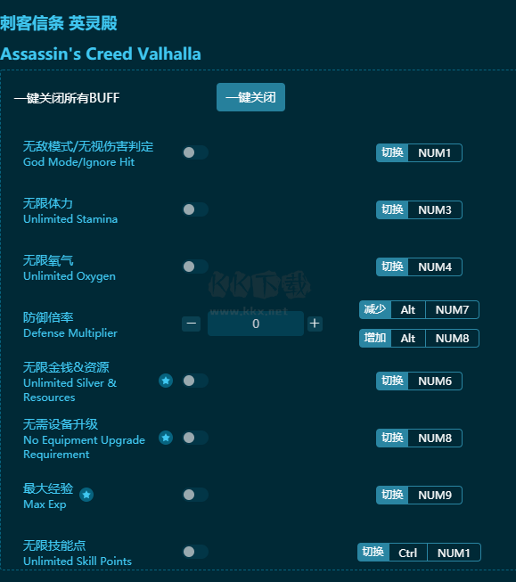 刺客信條:英靈殿二十項(xiàng)修改器鍵位說明