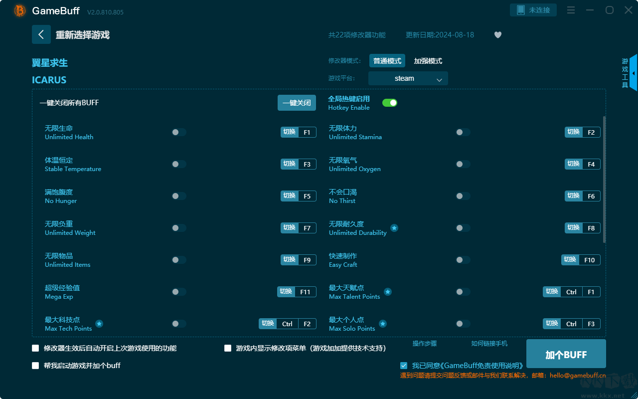 翼星求生二十二項修改器是一款功能十分強大的游戲輔助修改器工具,大家可以去幫助自己自由的修改設(shè)置擁有無限生命,體溫恒定,無限體力,無限氧氣,不會口渴,無限耐久度,最大天賦點,最大個人點,無限物品,超級經(jīng)驗值,快速制作等二十二項功能內(nèi)容去幫助自己解決各種游戲中遇到的困難與挑戰(zhàn),體驗輕松的戰(zhàn)斗以及多樣化的玩法,感興趣的朋友們千萬不要錯過哦,快來KK下載體驗一下游戲吧!