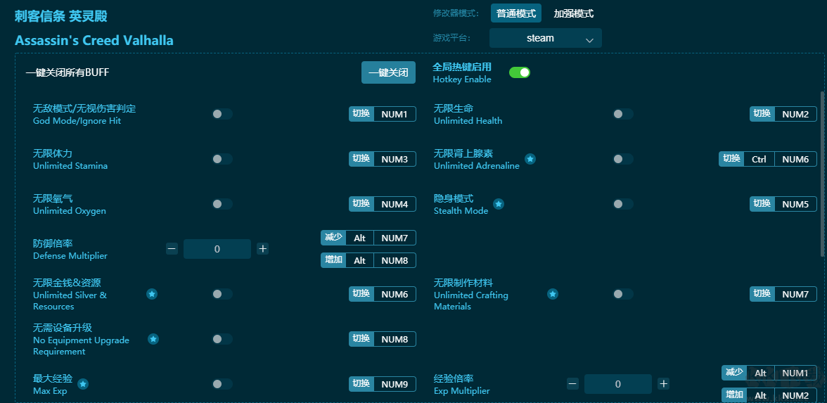 刺客信條:英靈殿二十八項(xiàng)修改器鍵位說(shuō)明