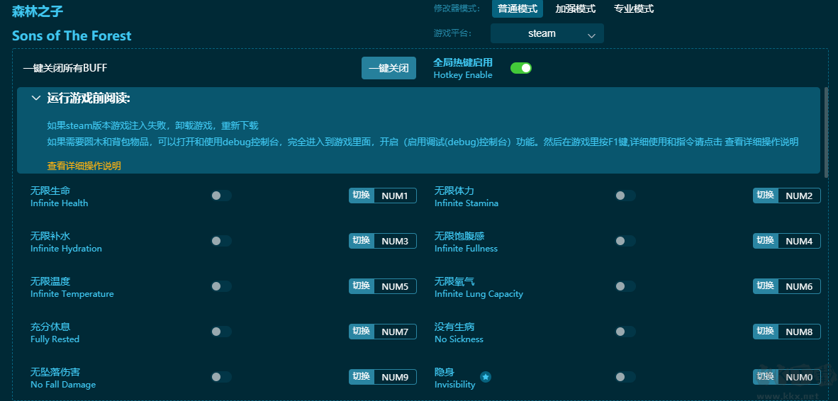森林之子二十五項(xiàng)修改器說(shuō)明