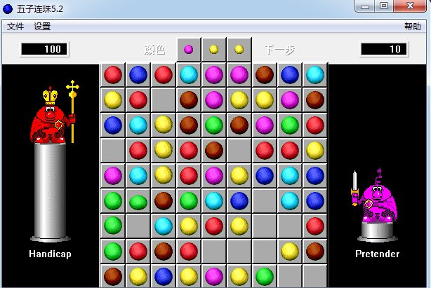你手中的武器就是可愛的彩球。你可以通過移動并將同種顏色的彩球以橫,豎,斜排的形式排列,五個以上將自動消除,當然,移動的條件是兩點間有連通的路徑??崭癯錆M則游戲結(jié)束。游戲中,你必須謹慎思考以得到最佳路徑。在危機時刻,你也可以巧妙地利用現(xiàn)有的炸彈來拯救自己。您可以選擇彩球的樣式來選擇您喜歡的彩球,也可以調(diào)整彩球的移動速度和彩球的數(shù)量來調(diào)整游戲難度。這款游戲還提供了輕松動聽的背景音樂和音效。游戲畫面精美,動畫逼真!可愛的彩球和國王讓人發(fā)笑,讓人在鍛煉智力的同時身心放松。你還在等什么?讓我們進入五子連珠的世界。