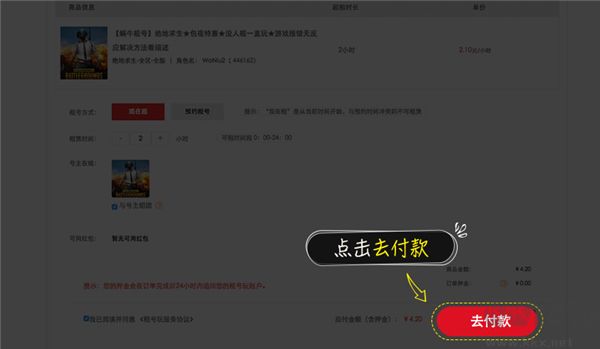 5、確認(rèn)所選賬號和租賃時(shí)間無誤后,點(diǎn)擊 “去付款”,完成支付流程;