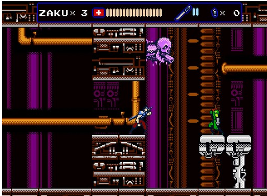 絕招 : 在游戲中按住B鍵不放,至到屏幕左端對應(yīng)的血格跳動,然后便能按↓發(fā)出絕招。但絕招在發(fā)的過程中不能遇到任何受傷的情況,如碰敵人及中子彈等,且血少于一半時也發(fā)不出,且消耗自己總血量的一半。