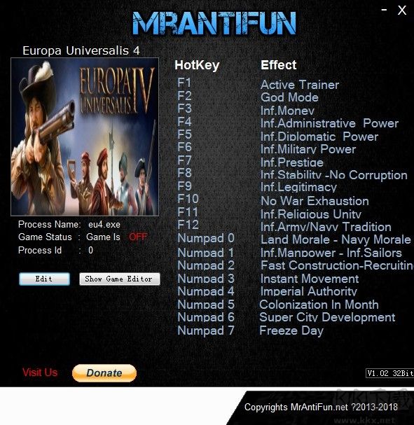 歐陸風(fēng)云4修改器是一款專門針對(duì)歐陸風(fēng)云4游戲所開(kāi)發(fā)的修改器,軟件能夠修改無(wú)限士兵、無(wú)線金錢、外交權(quán)、軍事權(quán)等眾多實(shí)用修改功能,幫助你輕松制霸整個(gè)游戲。歐陸風(fēng)云4是一款非常經(jīng)典的策略游戲,是《歐陸風(fēng)云》系列游戲的第四部作品,相對(duì)前幾部作品來(lái)說(shuō)加入了許多新鮮的游戲元素,如新地圖、新任務(wù)、新兵種等,而這款修改器能夠幫助大家更好的體驗(yàn)這款游戲,有需要的朋友可以下載使用哦。