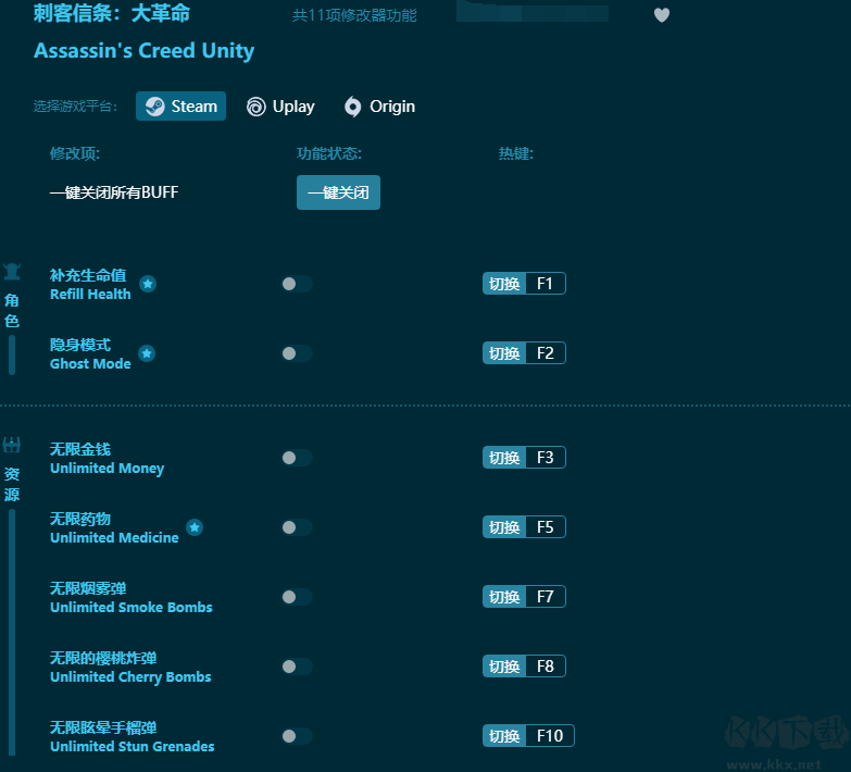 刺客信條大革命修改器是為廣大游戲愛好者提供的一款刺客信條大革命作弊器,讓玩家可以更加輕松的游戲,克服游戲中的各種困難,刺客信條大革命修改器為大家提供了快速補充生命、隱身模式、無限金錢、無限藥品、無限煙霧彈、無限的眩暈手榴彈等11項功能,有喜歡的朋友趕緊下載使用吧!