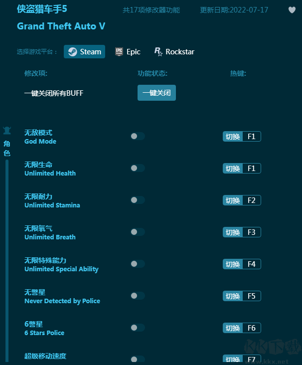 GTA5修改器是一款外置最新版的GTA5游戲修改器軟件。內(nèi)置十七項(xiàng)游戲修改,包括無(wú)敵,無(wú)限資源,無(wú)限金錢(qián)等等,能夠幫助玩家最大限度的降低游戲難度!感興趣的朋友不要錯(cuò)過(guò),KK下載站推薦大家下載體驗(yàn)!