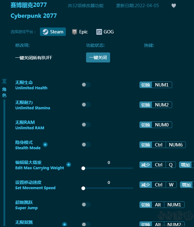 賽博朋克2077修改器是一款針對(duì)《賽博朋克2077》游戲開(kāi)發(fā)的修改器軟件。在游戲中,玩家能夠一鍵開(kāi)啟無(wú)限生命,無(wú)限耐力,隱身,超級(jí)跳躍等三十二項(xiàng)全能修改功能。幫助玩家更爽快的進(jìn)行游戲!感興趣的朋友不要錯(cuò)過(guò),KK下載站推薦大家下載體驗(yàn)!