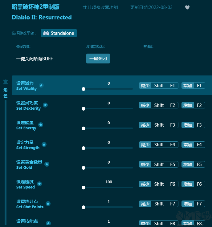 暗黑破壞神2重置版修改器是一款專為《暗黑破壞神2重置版》游戲打造的游戲輔助工具。內(nèi)置十一項(xiàng)游戲輔助功能可自由開(kāi)啟,活力,靈巧度,能量,力量,黃金等都可用玩家自由設(shè)置,讓玩家游戲體驗(yàn)更快樂(lè)!感興趣的朋友不要錯(cuò)過(guò),KK下載站推薦大家下載體驗(yàn)!