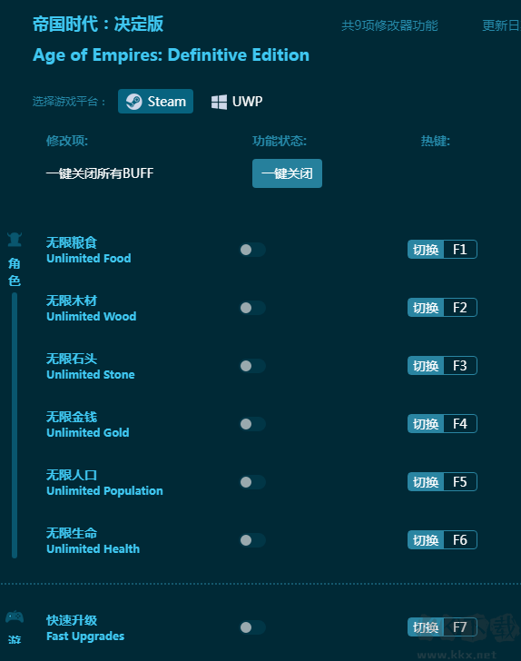 帝國時代決定版修改器專為《帝國時代決定版》玩家打造,帶來通用九項強力輔助,為玩家提供糧食,材料,生命,升級等多方面游戲輔助,讓玩家游戲體驗更佳,玩得更爽!感興趣的朋友不要錯過,KK下載站推薦大家下載體驗!