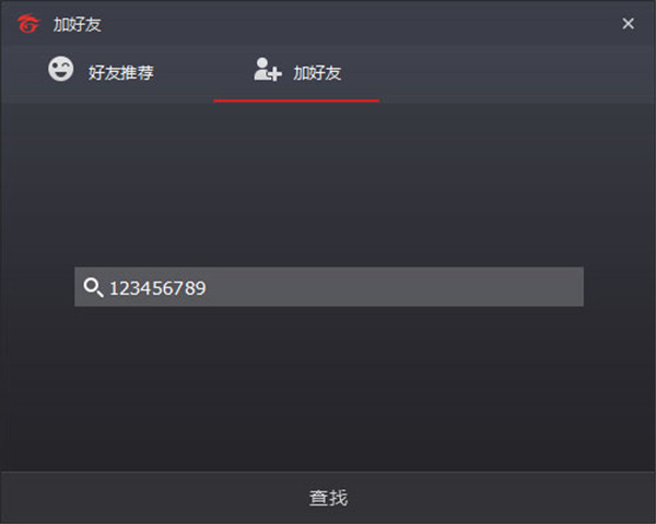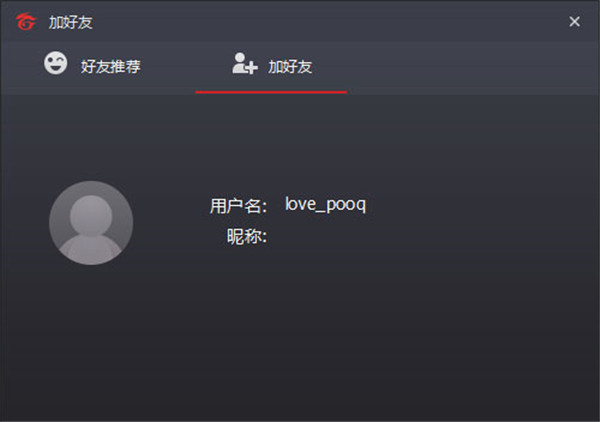 3、接下來會彈出好友添加窗口,我們輸入好友的ID賬號,然后進行搜索你會看到你好友的信息,我們選擇下方的添加就可以添加好友了;