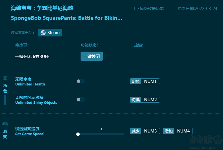 海綿寶寶:爭(zhēng)霸比基尼海灘修改器是一款針對(duì)游戲《海綿寶寶:爭(zhēng)霸比基尼海灘》玩家打造的多功能游戲修改器,為玩家?guī)砀p松的游戲體驗(yàn)。內(nèi)置無限生命,無限閃亮對(duì)象,設(shè)置游戲速度等強(qiáng)力游戲輔助,玩家可以自由使用,游戲體驗(yàn)更佳!感興趣的朋友不要錯(cuò)過,KK下載站推薦大家下載體驗(yàn)!