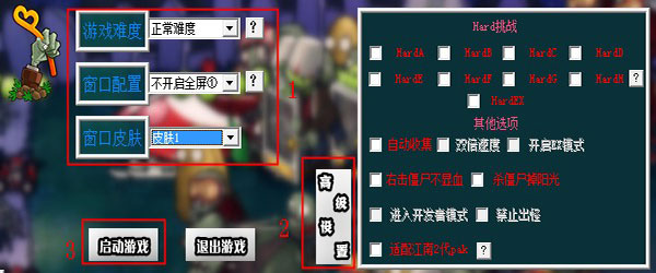 3、可以看到有游戲難度選擇、窗口、皮膚選擇等,按下圖操作即可,點(diǎn)擊高級(jí)設(shè)置,可以選擇開(kāi)啟各hard模式進(jìn)行游戲;