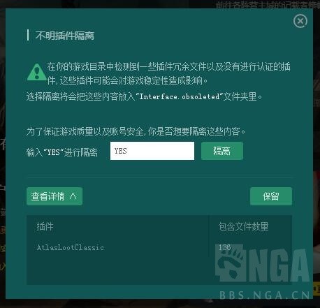 6、若有彈窗顯示“不明插件隔離”AtlasLootClassic、DBM等,請(qǐng)點(diǎn)保留