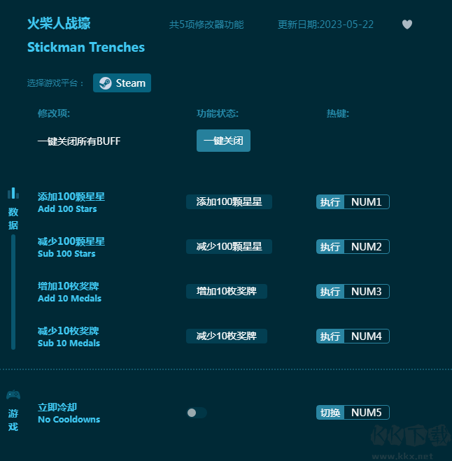 《火柴人戰(zhàn)壕》是一款趣味火柴人塔防游戲,玩家作為指揮官,操控火柴人對抗入侵。這款《火柴人戰(zhàn)壕修改器》提供玩家增加星星,減少星星,增加獎(jiǎng)牌,減少獎(jiǎng)牌,立即冷卻等多項(xiàng)游戲輔助,玩家可以免費(fèi)使用,讓游戲更輕松!有需要的朋友不要錯(cuò)過,KK下載站推薦大家下載體驗(yàn)!