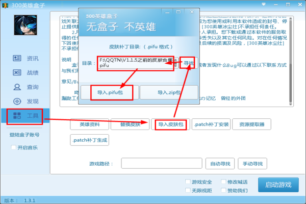 3、打開300英雄盒子,點(diǎn)擊切換到“工具”選項(xiàng)卡中,在其中點(diǎn)擊“導(dǎo)入皮膚包”按鈕。