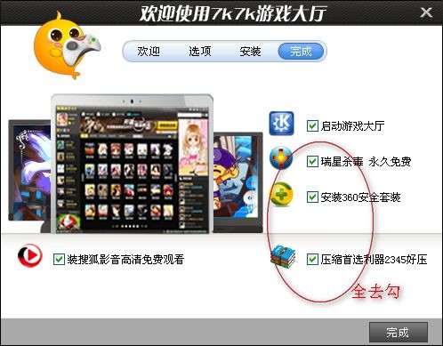 2、游戲安裝過程中會提示是否安裝關(guān)聯(lián)軟件,記得將選項全部取消勾選,最好點擊“完成”按鈕就可以完成安裝了。
