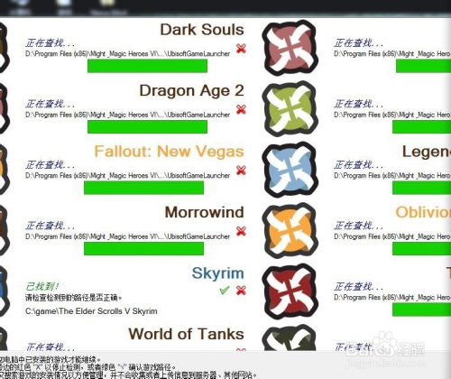 安裝nmm時,軟件會搜索游戲,這時為了方便,只要搜索到上古卷軸5,就可以關(guān)掉其他的搜索,如下圖,將skyrim點√,其他直接點×,然后確定安裝即可。