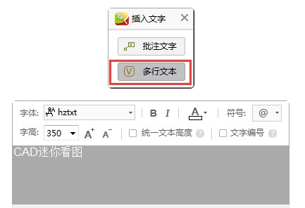 點(diǎn)擊“A”按鍵,一般插入文字的話選擇“多行文本”,最后在編輯框輸入你要的文字確定就可以了。