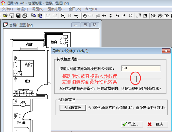 “轉換粒度調(diào)整”用于調(diào)整處理顏色的界限值,直接拖動紅圈中的滑塊或輸入值,看到當前預覽圖達到最好的效果即可(去掉不需要的裝飾,保留墻體等主要結構)。