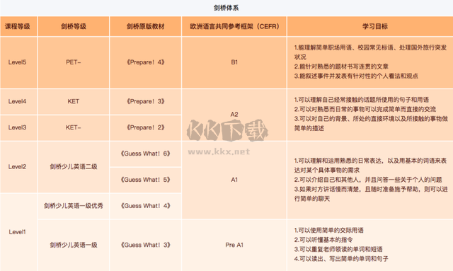 而劍橋英語(yǔ)課程設(shè)為L(zhǎng)1~L5共5個(gè)級(jí)別,分別對(duì)標(biāo)CEFR、劍橋考試等級(jí),最高級(jí)別可達(dá)PET水平,并且該課程使用劍橋原版教材,整體學(xué)習(xí)目標(biāo)要求較高。