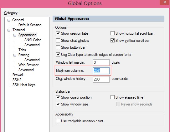 大顯示器上若SecureCRT顯示不能占滿整個屏幕,可通過GlobalOptions/Terminal/Appearance/Maximumcolumns來調(diào)整: