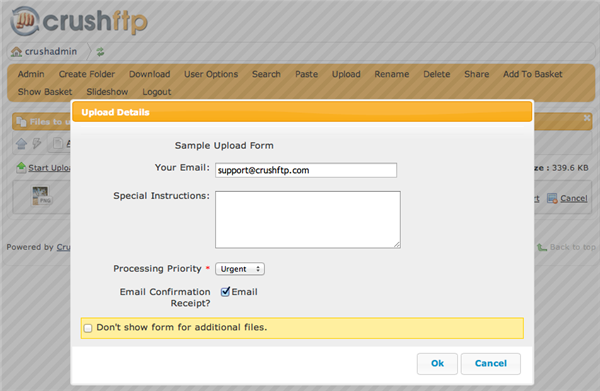 當(dāng)項目投放到界面上,或使用正常的 "瀏覽... "方法選擇項目時,它們會被添加到上傳隊列中。如果為用戶的上傳定義了自定義表單,則會顯示該表單,要求用戶提供有關(guān)上傳的其他信息。自定義表單可以按用戶定義,功能非常強大和靈活。需要上傳附加信息是一種常見需求。