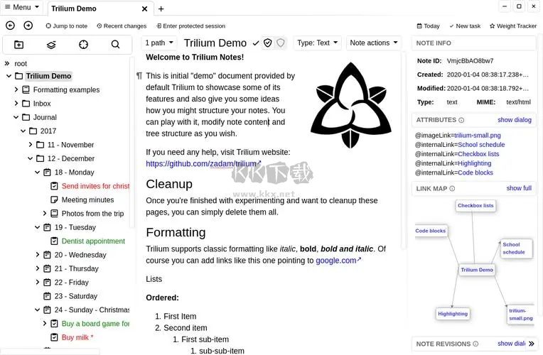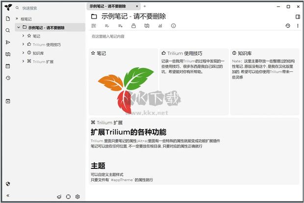 Trilium Notes開(kāi)源筆記客戶端是一款全功能好用的筆記管理軟件,能夠滿足用戶們的記錄需求,Trilium Notes開(kāi)源筆記客戶端擁有豐富便捷的筆記記錄功能讓用戶們可以在快捷的在線進(jìn)行筆記的記錄和分享,感興趣的用戶們快來(lái)KK下載體驗(yàn)吧~